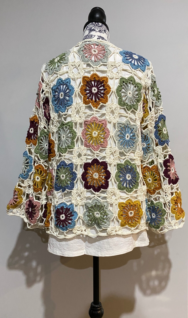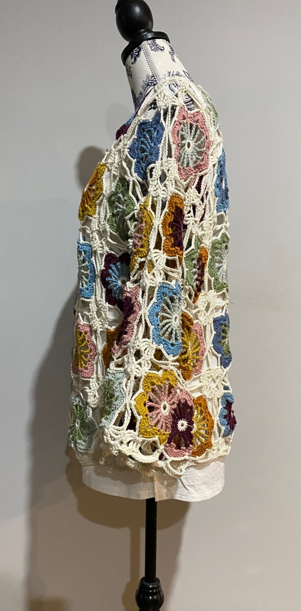 Experience the Softness of Bamboo and Cotton in this Lovely multi Coloured Crocheted Cardigan, perfect for Spring it would suit a size small to medium.
