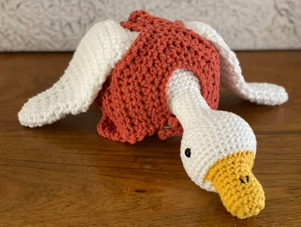 This lovely huggable goose comes with its own removable cape. Made with Loins Brand "feels like butter" yarn, it is so very soft to the touch. 34cm long and 36cm wide