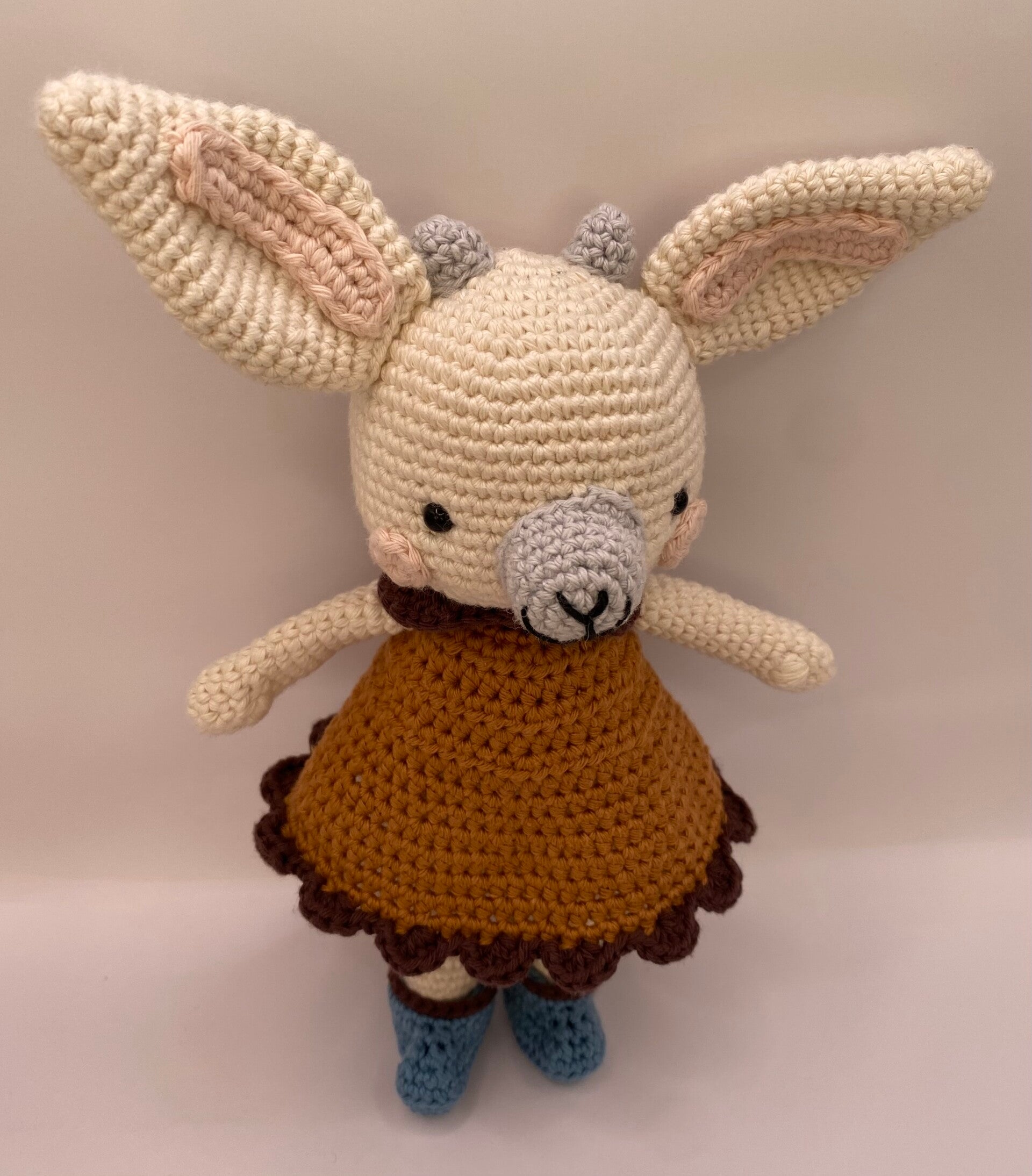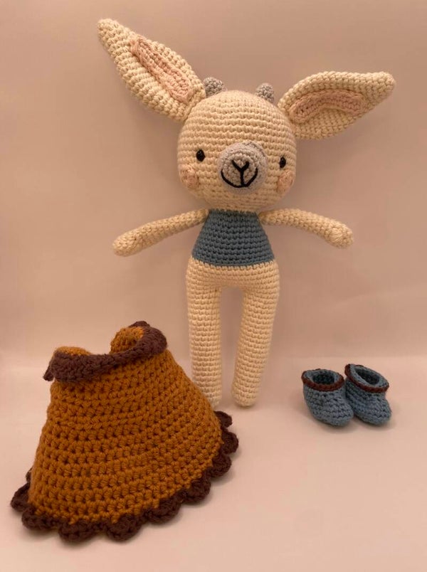 Beautiful Bell Lamb, featuring a separate dress and boots, measuring 22cm in height and 17cm in width. Crocheted with 100% cotton.
